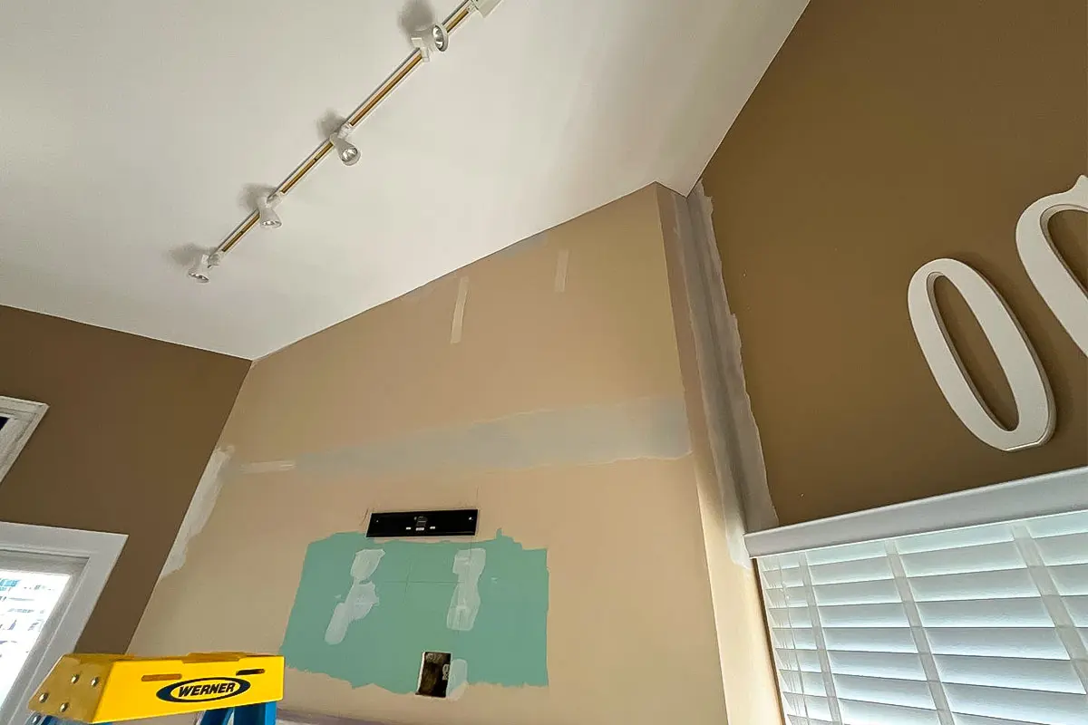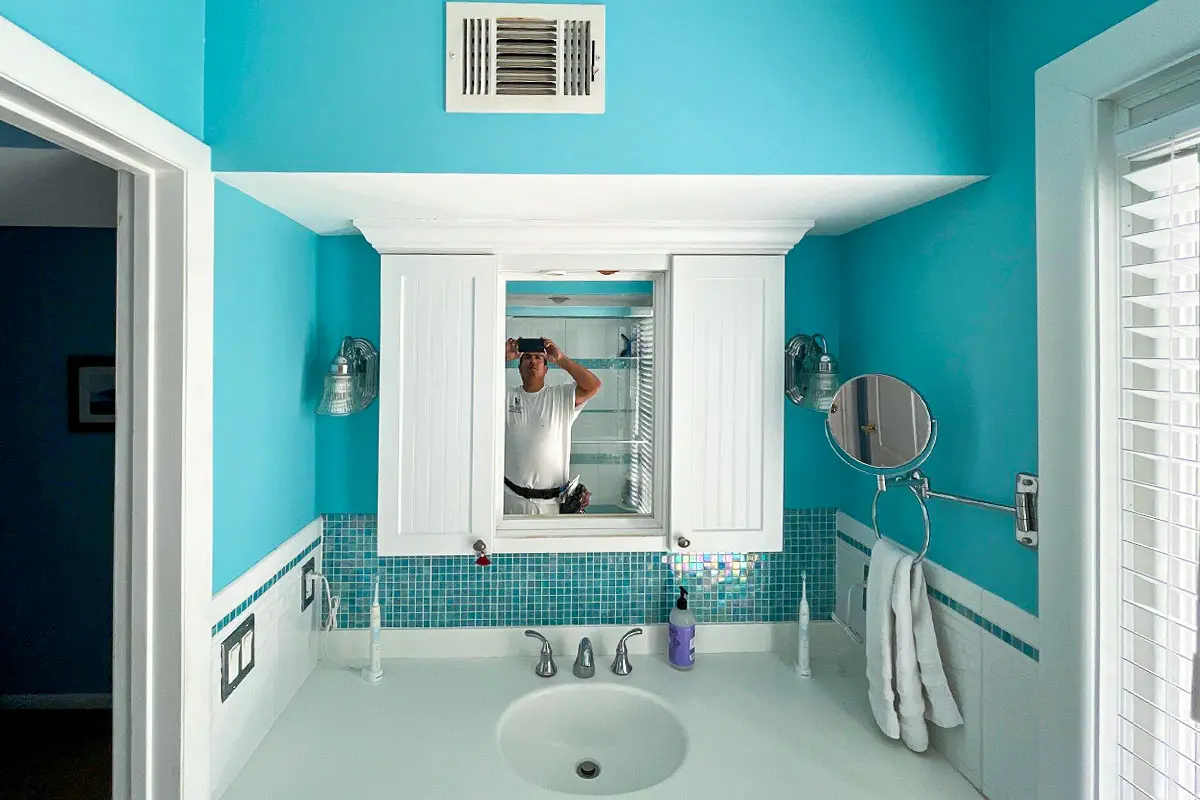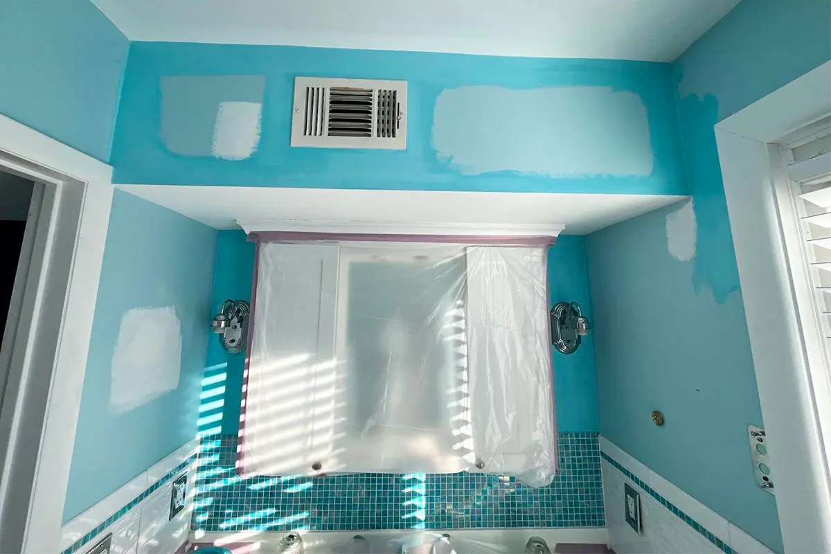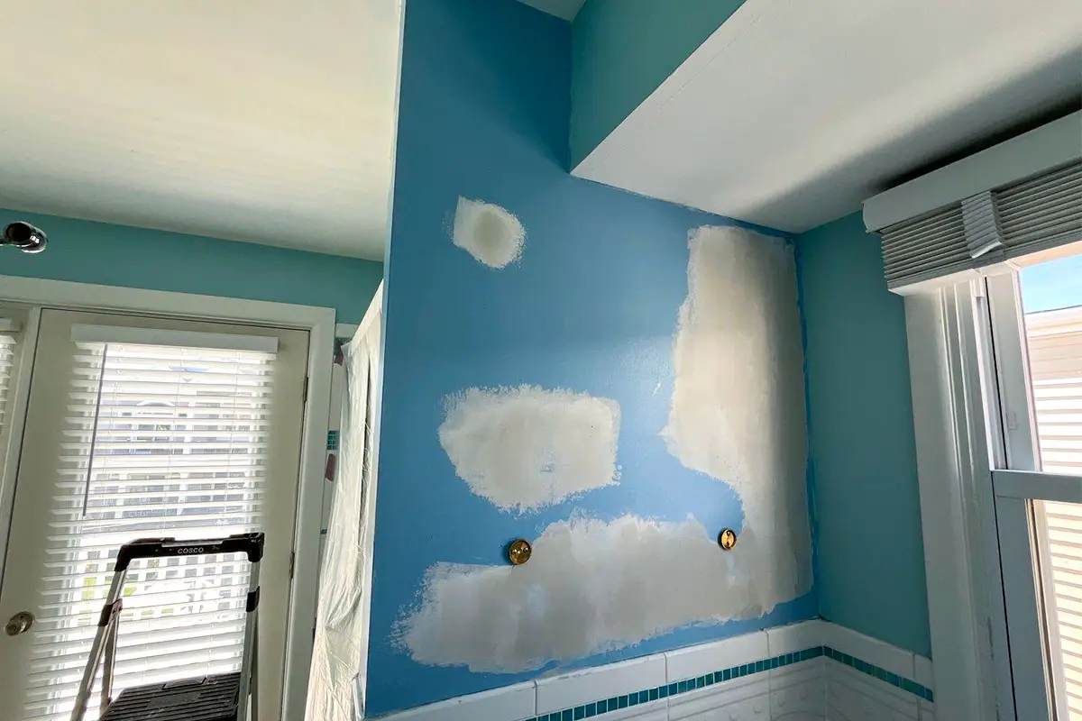 Project photos highlighting interior wall repairs, careful surface prep, crisp cut lines, and a refreshed finish across the bathroom and living areas.